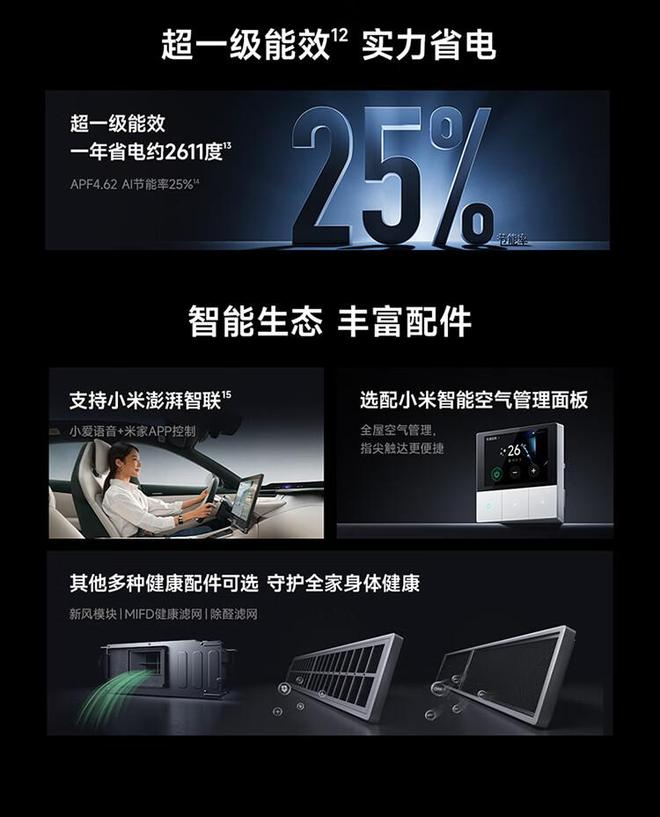 这款中央空调支持小米澎湃智联,支持超级小爱控制、车内语音提前打开空调、OTA 在线升级等功能;还可选配小米智能空气管理面板等多种健康配件。
