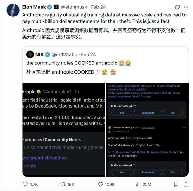 一向看热闹不嫌事大的马斯克,在 Anthropic 的调查报告发出来没多久,直接在 X 上嘲讽开大。说 Anthropic 才是那个大规模盗取数据、还为此赔了数十亿美金的惯犯。