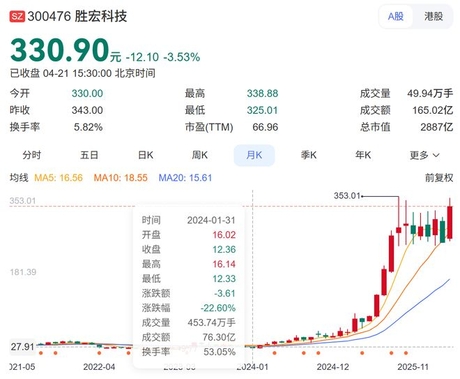 当天午间,胜宏科技在A股报收329元/股,跌幅为4.08%。