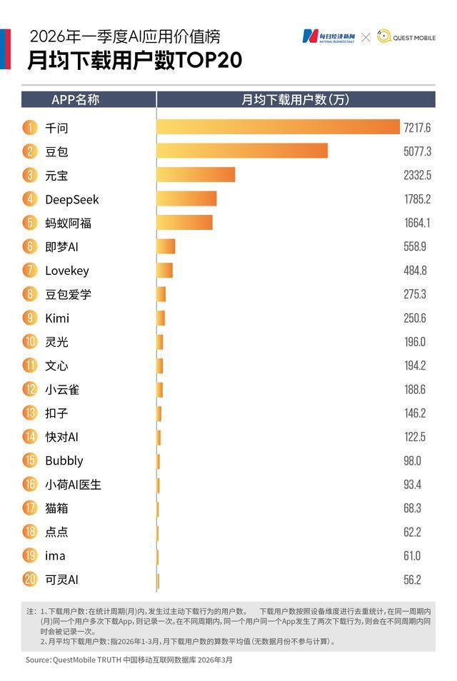 近四成中国网民手机装AI,豆包月活逼近3.5亿,元宝跌出前三,Kimi、智谱为何“掉队”?|2026年一季度AI应用价值榜