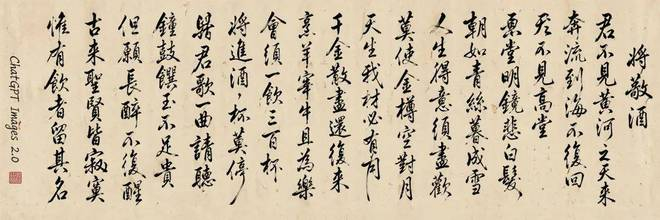 接下来我们继续,「生成一张《将敬酒》繁体中文草书书法作品,宽高比 3:1,内容是李白的《将敬酒》全文。落款是 ChatGPT Images 2.0」: