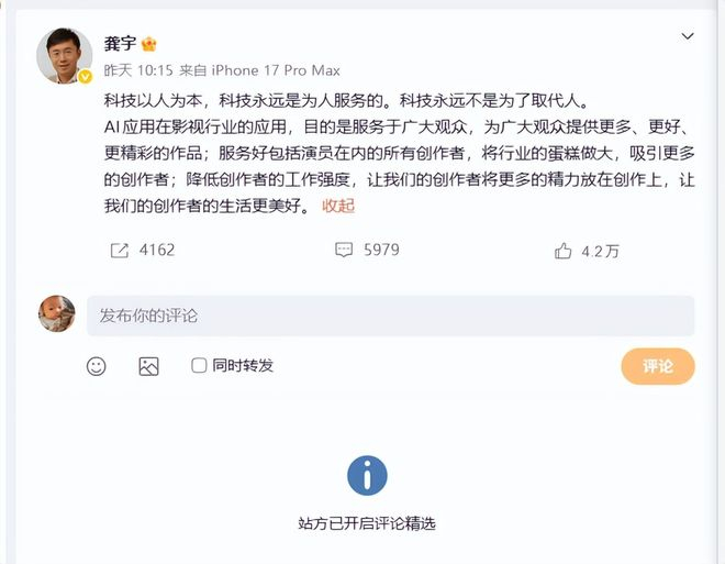 舆论风波后,龚宇连发三条微博,大意是AI剧不是为了取代人,而是为了服务人。不过眼下, 这三条微博已经开启了评论精选。