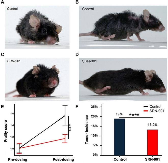 从外观上看,未服药的小鼠出现了明显的衰老体征:松弛的皮肤、灰白稀疏的毛发、佝偻的体态。而接受SRN-901治疗的小鼠则保持了紧致的皮肤、乌黑浓密的毛发和正常的体态,外貌与中年几乎无异。同时,肿瘤发病率也下降了30.53%。