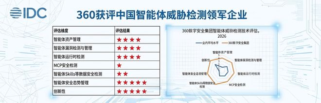 近日,全球知名IT研究咨询公司IDC正式发布《中国智能体威胁检测技术评估,2026》重磅报告。三六零数字安全集团在本次权威评估中斩获首位推荐,综合实力位居中国智能体安全厂商第一梯队,获评智能体威胁检测领域领军企业。