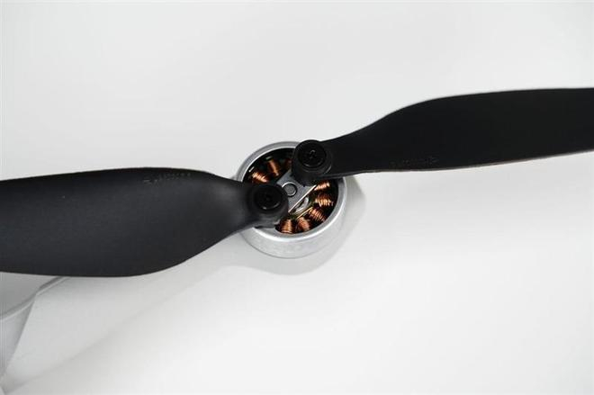 大疆Lito X1机臂上的无刷电机特写,可见铜质绕组与快拆式黑色螺旋桨,气动优化的桨叶让飞行更稳,噪音更低。
