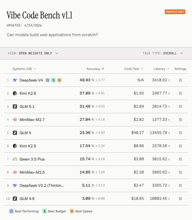 另一家测评方Vals AI称,DeepSeek-V4在其Vibe Code Benchmark(氛围代码基准)中以“压倒性优势”拿下开源权重模型榜首,较上代V3.2实现约10倍性能跃升,甚至击败了像Gemini 3.1 Pro这样的顶尖闭源模型。DeepSeek-V4也是唯一一个在Vibe Code Benchmar上突破40%的开源权重模型。