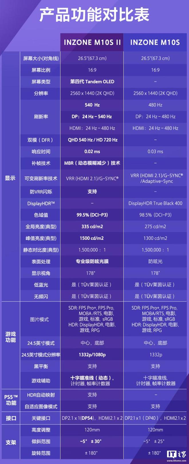 IT之家 4 月 25 日消息,索尼 INZONE 英纵 M10S II 电竞显示器现已开售,新品搭载 26.5 英寸 OLED 面板,支持 2K 540Hz/720P 720Hz 双模切换,售价 8499 元。