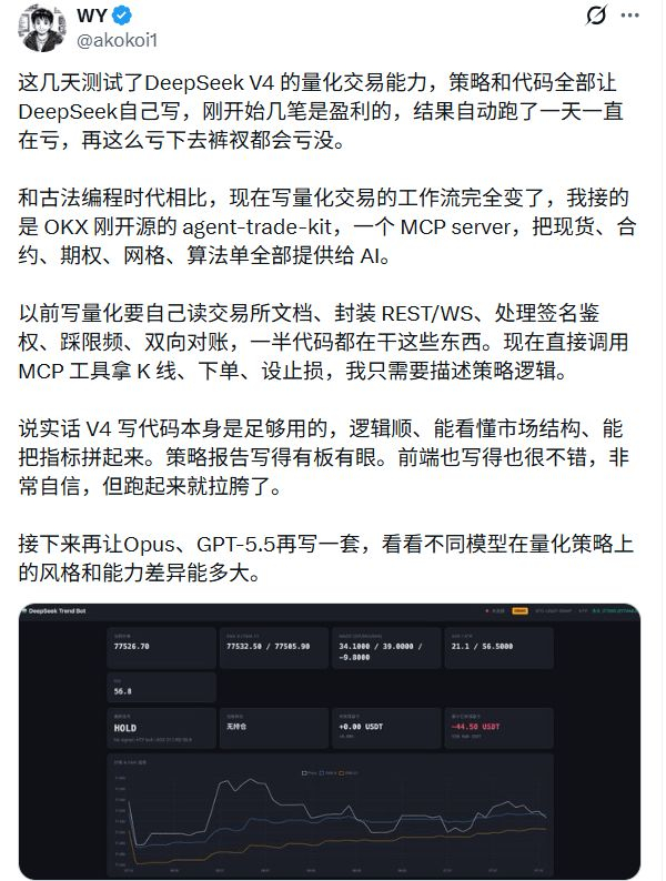 类似的挫败也出现在更垂直的领域。AI Agent开发与测试员@akokoi1分享了他用DeepSeek V4做量化交易的经历。策略和代码全线交给V4自己写。他接入了OKX刚开源的agent-trade-kit,一个MCP服务器,能把现货、合约、期权、网格交易、算法单的接口全部直接提供给AI调用。