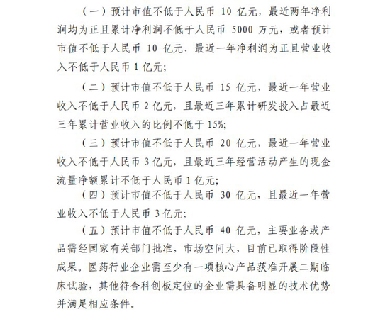 按照《上海证券交易所科创板股票上市规则》,拟申请科创板上市的企业,以下5套市值和财务标准至少符合1条: