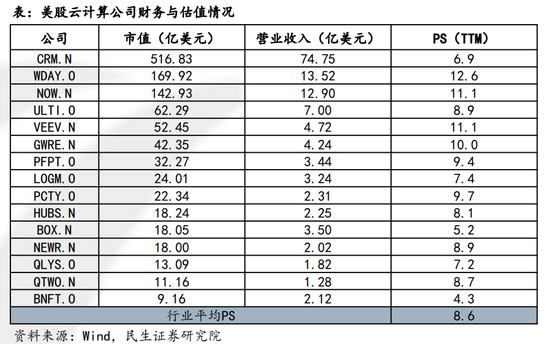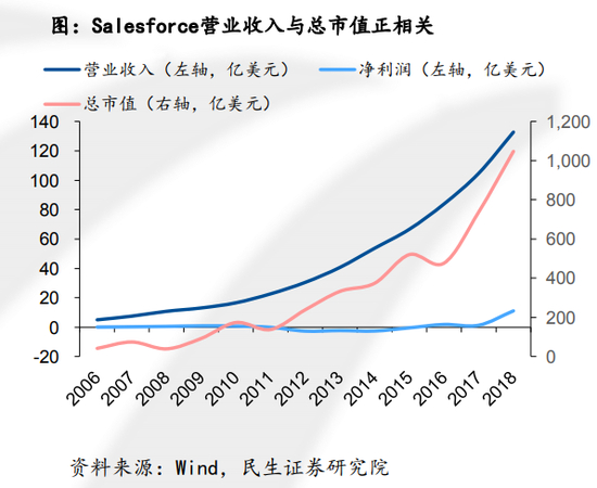 以美国云计算巨头Salesforce为例,公司2006-2018年间收入快速增长,但盈利能力并不稳定,公司市值与营业收入呈现较为明显的正相关性。从估值水平来看,公司PE波动较大缺乏参考价值,而PS则基本处于6-9x的区间。由此可见,对于云计算公司,PS是更为适宜的估值方式。
