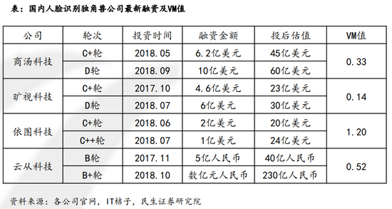 我们计算了四家公司最近两轮融资的VM值,其中商汤与旷视的VM值小于0.5,云从的VM值也较为接近0.5,依图的VM值较大的主要原因是两轮融资间仅相隔一个月。 (VM参考值为0.5)