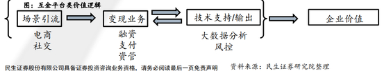 平台综合类企业:常覆盖上述全部或部分业务,多是互联网巨头布局金融业务的产物,通产由场景引流结合变现业务(以电商、社交场景为基础,开展支付、融资、资管业务),数据收集/沉淀(利用业务数据作为风控和定价基础),技术支持/输出(利用企业自身技术优势,开展金融创新,运营维护)等部分组成。例:蚂蚁花呗=支付+融资业务。