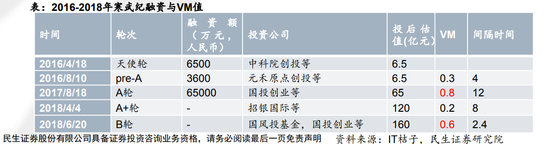 目前寒武纪VM指数看,17年和18年融资都出现VM超过0.5的情况,考虑到麒麟970出台量在17年有大幅度增长,以及18年公司研发出性能功耗全面超越CPU和GPU的MLU100机器学习处理器芯片,导致公司估值上升较快。