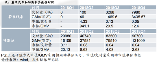 但无论是已上市的特斯拉,蔚来汽车,还是传言有望登陆科创板的小鹏汽车,奇点汽车。从新造车行业公司年净利情况看,均处于亏损的状态,公司处于一个初创期或早期成长期,因此无法直接使用PE估值进行对比。但考虑到可以通过对比汽车销量,以及市占率的变化来进行公司对比。因此,可以采用PS估值,市值/GMV,市值/交付量值进行投资指引。