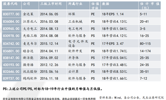 睿创微纳:作为在百万级像素红外MEMS芯片、12及17微米探测器领域有多项突破,且所掌握的非制冷红外芯片设计技术,仅4国家拥有。公司采用预计市值不低于人民币10亿元,最近一年净利润为正且营业收入不低于人民币1亿元的第一类创业板上市标准,说明公司对自己的盈利能力有信心,可作为成熟期科技企业进行预测估值。