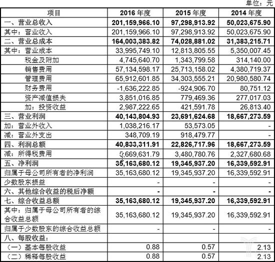 根据招股书材料显示,什么值得买2016年营业收入2.01亿元,营业成本3399万元、净利润为3516万元。