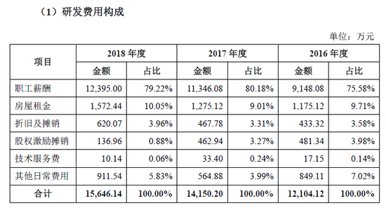 从研发费用构成来看,近八成是职工薪酬,2018年达到了1.24亿元,公司在招股书中表示,为提高产品市场竞争力,公司持续加大研发投入力度,增加研发人员数量,导致职工薪酬增加。截至 2018 年底,公司员工总数为 883 人,其中技术员 358 人,占公司总数 40.54% 。