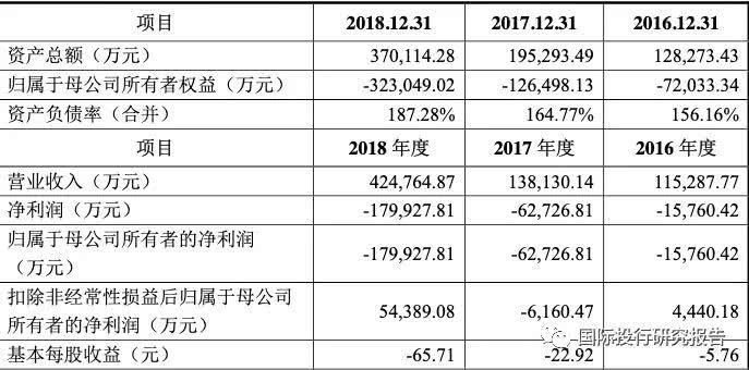 这家公司最近连续3年巨亏,2016年亏损1.5亿,2017年亏6.2亿,2018年亏损18亿,归属于母公司的所有者权益为-32亿,而总资产只有37亿,资产负债率187.28%。
