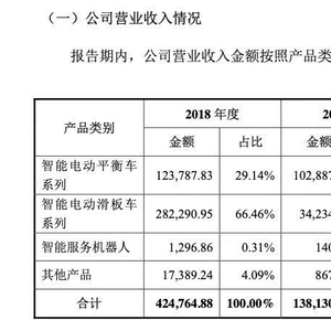 看名头,凌通社和大家一样以为是一个制造机器人的公司,但事实上到目前为止,这只是一家以生产滑板车为主业的传统企业。公司2018年的收入显示,其主要生产二大产品,第一大产品是电动滑板车,第二大产品是电动平衡车,其他产品收入微乎其微。