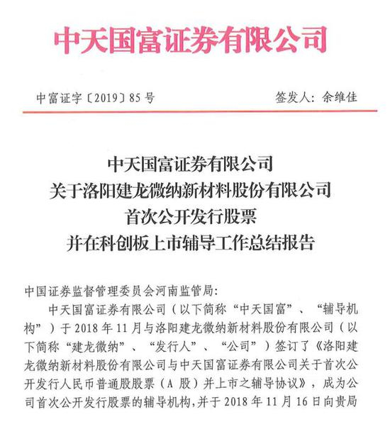 据此前报道,2018年11月,中天国富与建龙微纳签署了辅导协议,中天国富向河南证监局提交了辅导备案材料,并获河南证监局受理备案。