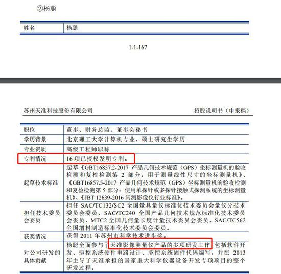 资料显示,杨聪,1976年10月出生,毕业于北京理工大学,硕士研究生学历;2002年4月~2005年12月,担任北京华控科技有限公司产品经理;2006年1月~2009年7月,担任北京天准科技有限责任公司研发经理;2009年8月~2015年2月,担任天准科技总工程师兼董事;2015年2月至 今,担任天准科技董事兼董事会秘书,2016年5月至今担任天准科技财务总监,目前为公司董事、董秘、财务总监。