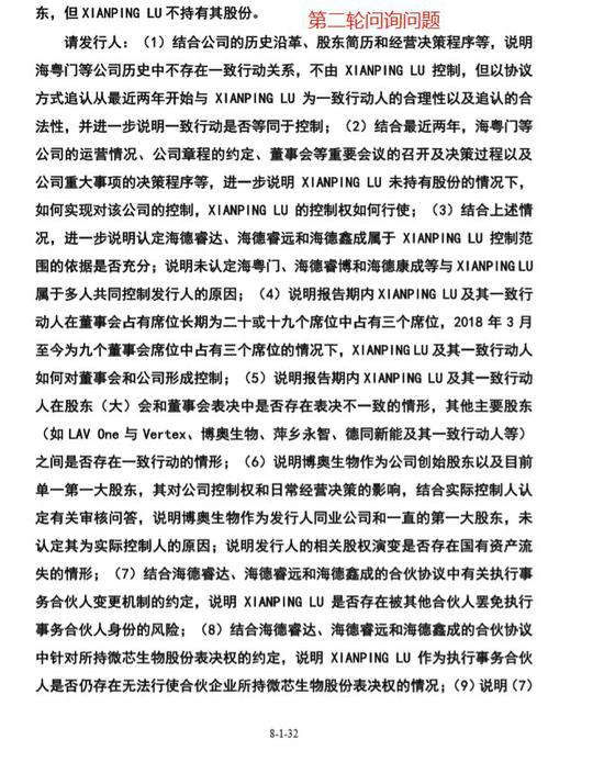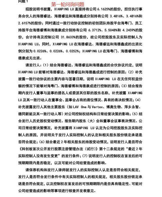 第一轮问询,问题比较多,公司招股书显示,实际控制人XIANPING LU 直接持有公司6.1625%的股份,担任执行事务合伙人的海德睿达、海德睿远和海德鑫成分别持有公司3.4816%、3.4816%和2.6157%的股份。同时通过一致行动协议控制的初创团队持股平台海粤门、员工持股平台海德睿博和海德康成分别持有公司6.3712%、5.5048%和 4.2459%的股份,合计持有及控制公司31.8633%的股份,故公司控股股东及实际控制人为XIANPING LU。