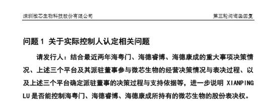 没想到完成第二轮问询回复后,又来了第三轮问询,仍旧关注实际控制人认定问题,上交所要求公司结合最近两年海粤门、海德睿博、海德康成的重大事项决策情况、上述三个平台及其派驻董事参与微芯生物的经营决策情况与表决过程、以及上述三个平台确定派驻董事的决策过程与支持依据等,进一步说明XIANPING LU是否能控制海粤门、海德睿博、海德康成所持有的微芯生物的股份表决权。