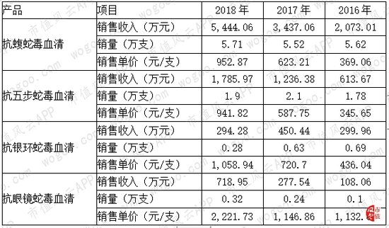 但是产品售价增长势头非常彪悍,比如抗蝮蛇毒血清,16年卖369.06元一支,18年就卖到952.87元一支,涨价幅度高达158.19%。同样的情况还发生在其他三种产品上,与16的平均销售单价相比,抗五步蛇毒血清18年的平均售价增长了172.48%;抗银环蛇毒血清18年平均售价增长了142.85%;抗眼镜蛇毒血清18年平均售价增长了96.15%。