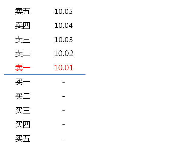 如上图所示情形下,投资者可以低于或等于10.21元的任何价格申报买入,也就是说,投资者在下买单时有报价上限,为10.21元,没有价格下限。