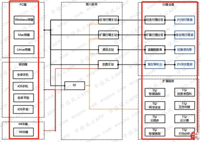 在证券行情交易软件和服务领域,公司的上游主要为交易所等掌握证券行情原始数据的机构,也包括操作系统/数据库/开发工具等软件供应商、电脑设备/通信设备等硬件供应商及通讯供应商等;行业下游主要为证券公司等金融机构。