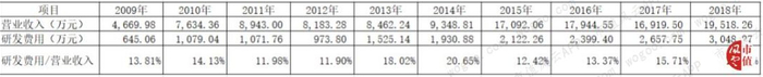 公司2009年至2018年研发投入较少,占营业收入的比重基本在15%左右,但最近三年累计的研发费用占最近三年累计的营业收入未超过为14.9%,未超过15%。