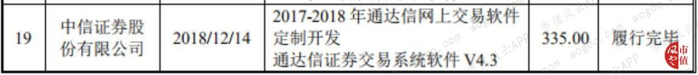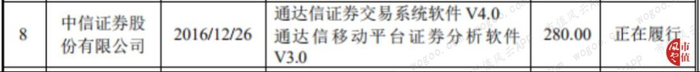 公司招股书中披露重要合同,其中2016年12月与中信证券股份有限公司签订的通达信证券交易系统软件V4.0及通达信移动平台证券分析软件V3.0合同尚未履行完毕,而2018年12月与中信证券股份有限公司签订的通达信证券交易系统软件V4.3及2017-2018年通达信网上交易软件定制开发已经履行完毕。