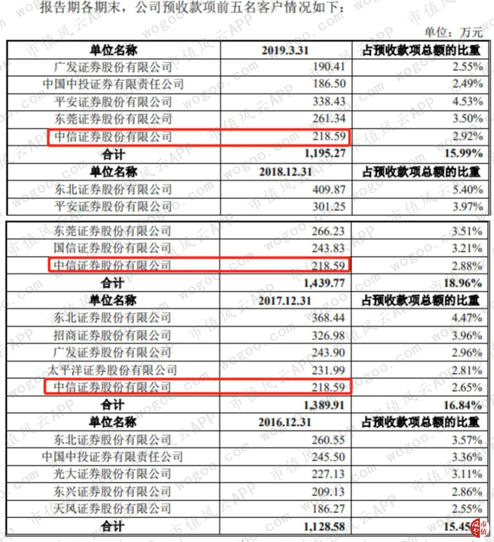 公司2019年招股书申报稿中披露的报告期内的预收账款前五大客户中,中信证券股份有限公司引起了风云君的注意。从2017年末至2019年3季末,两年多的时间,公司预收中信证券的款项一分没变。