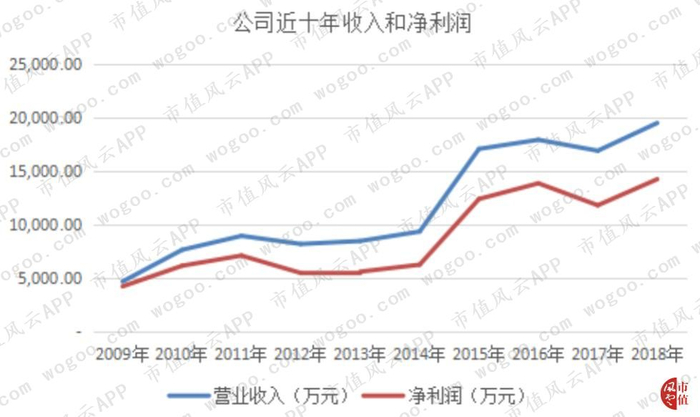 公司2009年营业收入为4,669.98万元,经过十年的时间增长到19,518.26万元,年均复合增长率为17.22%;净利润从4,211.3万元增长至14,251.82万元,年均复合增长率为14.51%。净利润与营业收入呈同步变动趋势。