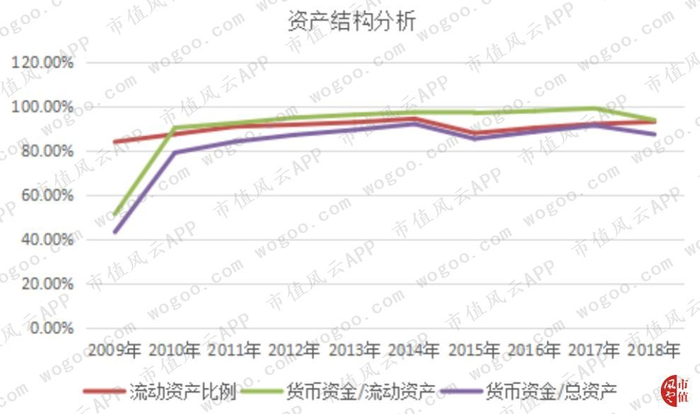 公司的资产主要是流动资产,2009年至2018年流动资产占比均在80%以上。流动资产中货币资金是最主要的,从2010年开始,货币资金占流动资产和占总资产的比例均在80%以上,从下表中我们可以看出,公司真的是不差钱,可以说只剩下钱了!