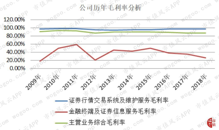 公司2009年至2018年证券行情交易系统及维护服务业务毛利率均在95%以上,主营业务综合毛利率也未低于85%,该业务看起来是黄金地带!