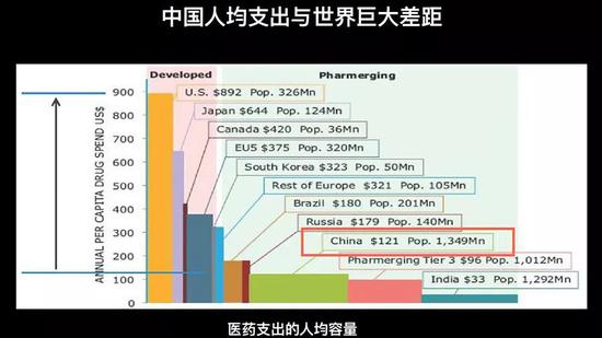 中国人均医药支出跟西方国家差距太大了。我们有13亿人口, GDP总量全世界第二,但是人均医药支出很低,比印度高一点点,比俄罗斯、巴西都低得多。