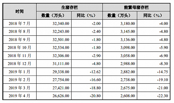 根据农业农村部公布信息,去年8月我国发生非洲猪瘟疫情以来,截至今年4月22日,共发生了129起非洲猪瘟疫情。受疫情影响,生猪存栏自2019年1月以来出现快速下降。2018年11月至2019年4月,各月生猪存栏分别为32306万头、31111万头、29338万头、27754万头、27421万头、26626万头,同比下降分别为2.9%、4.8%、12.62%、16.6%、18.8%、20.8%。