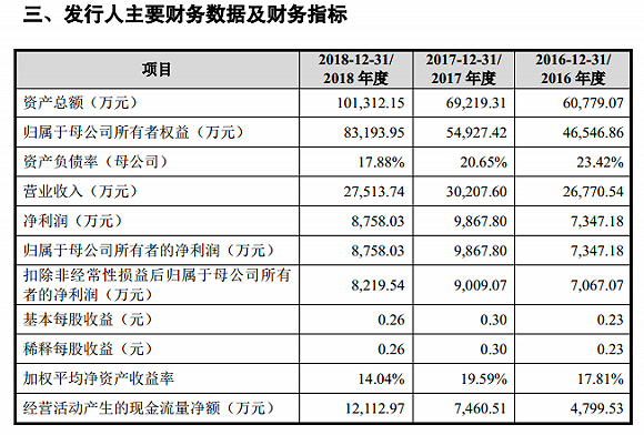 但从2018年起,该公司数据开始走下坡路,该年营业收入和归母净利润分别为27513.74万元和8758.03万元,同比分别下滑了8.92%和11.25%。2019年一季度,申联生物的营业收入和归属于母公司股东净利润分别为9483.16万元和3509.12万元,同比分别下滑13.25%和14.21%,公司经营活动产生的现金流量净额为-3726万元。申联生物还在说明书中披露了未经审计的上半年数据,营业收入1.3亿元,同比下滑12.49%,净利润3896.28万元,同比下滑了10.23%。