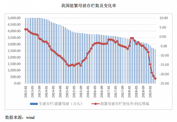 2018年7月,我国能繁母猪存栏量3180万头。2018年11月至2019年4月,能繁母猪存栏量分别为3058万头、2988万头、2882万头、2738万头、2675万头、2608万头,同比下降分别为6.9%、8.3%、14.75%、19.1%、21%、22.3%。显然,能繁母猪的减少会导致未来生猪出栏受到影响,预计未来一段时间内,包括公司在内的猪口蹄疫疫苗生产企业的经营仍将受到非洲猪瘟的影响。