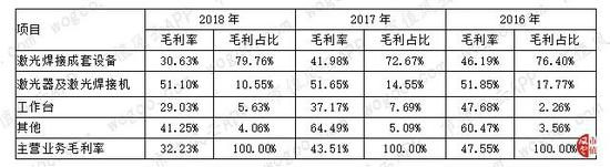 “罪魁祸首”就是第一大主营业务激光焊接成套设备,这块业务2016年的毛利率为46.19%,到2018年已经降至30.63%,下降了15.56个百分点。