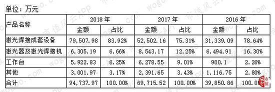 从产品来看,第一大主营产品是激光焊接成套设备,在主营业务收入中的占比呈上升趋势,该产品营收从2016年的3.13亿增长至2018年的7.95亿,年复合增长率高达59.28%。营收占比则从78.64%上升至83.92%,在主营业务中占据绝对主导地位。