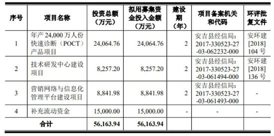 公司本次拟公开发行人民币普通股3,000 万股,占发行后总股本的 25.00%,预计募资5.62亿元用于公司主营业务相关的项目及所需营运资金,其中包括耗资约2.41亿元的年产24,000万人份快速诊断(POCT)产品项目,8,257.20万元的技术研发中心建设项目以及8,841.98万元的营销网络与信息化管理平台建设项目等。