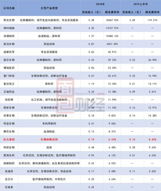 将研发投入情况放到同样申报科创板的企业中,东方基因的研发费用及研发费用率也是处于较低水平。截止10月18日,科创板中申报的生物医药产业公司有20多家。其中,君实生物、神州细胞、泽璟制药以及前沿生物由于公司目前营收规模相对较小导致研发费用率显著高于同业,尚不具有参考意义。