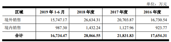 招股书显示,东方基因主要向境外医疗器械经销商提供体外诊断试剂,外销收入是公司收入的主要来源。2016年至2019年上半年,公司境外销售收入分别为16,730.54万元、20,703.87万元、26,634.31万元和15,747.17万元,占比分别为94.77%、94.83%、94.90%和94.10%。