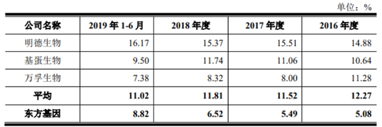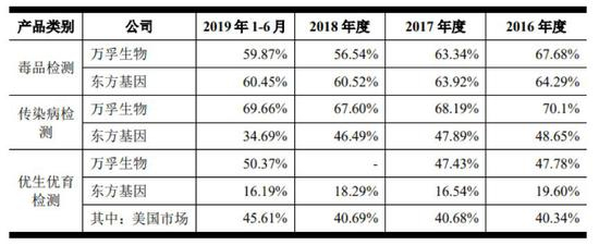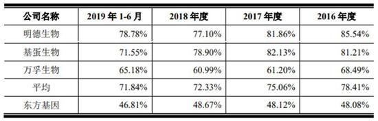 东方基因在招股书中称,公司毛利率保持较高水平且相对平稳。2016年至2019年上半年,公司综合毛利率分别为48.08%、48.12%、48.67%和 46.81%。