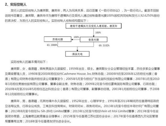 根据新华社报道,唐翔千是香港工商界著名实业家,江苏无锡人,1950年赴香港定居。1953年创办中南纺织厂。1969年成立香港南联实业公司。1992年被聘为首批香港事务顾问。曾任香港棉纺同业公会主席,香港工业总会会长、名誉会长,香港总商会副主席,香港特别行政区筹备委员会委员和第一届政府推选委员会委员,香港特别行政区基本法咨询委员会执行委员会副主席,香港特别行政区第十一届全国人民代表大会代表选举会议成员。唐翔千于2018年3月去世,其生前通过控制控股股东香港光膜的股权间接控制清溢光电92.6250%股份的表决权,根据唐翔千先生遗嘱,唐英敏、唐英年为遗嘱执行及受托人。