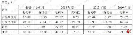 分产品来看,安全终端类产品的毛利率相对比较稳健,2016年至2018年大致在27%左右波动,但是2019年上半年下降至17.88%,跟2018年相比下降了8.94个百分点。