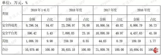 从收入结构来看,安全终端类产品收入占公司主营业务收入的比重分别为从2016年的56.73%上升至2019年上半年的84.67%,整体呈上升趋势。