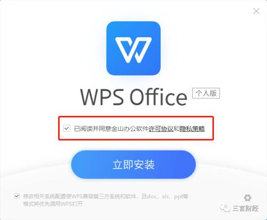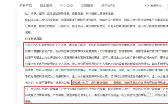 在用户安装WPS时,会要求勾选“许可协议和隐私策略”。在用户隐私策略协议中有这样的描述,使用该软件就表示“已经默认允许软件推送营销广告”等内容。